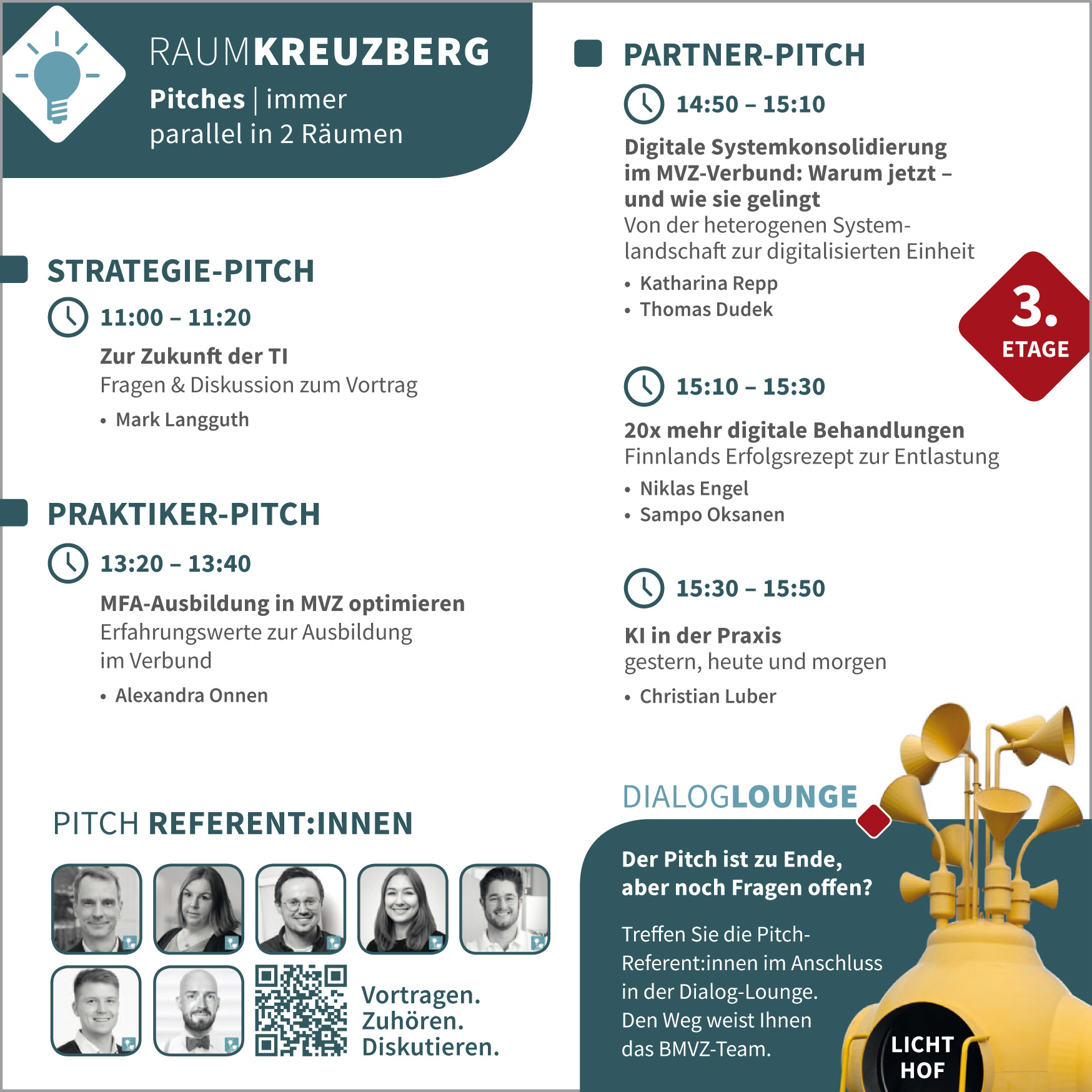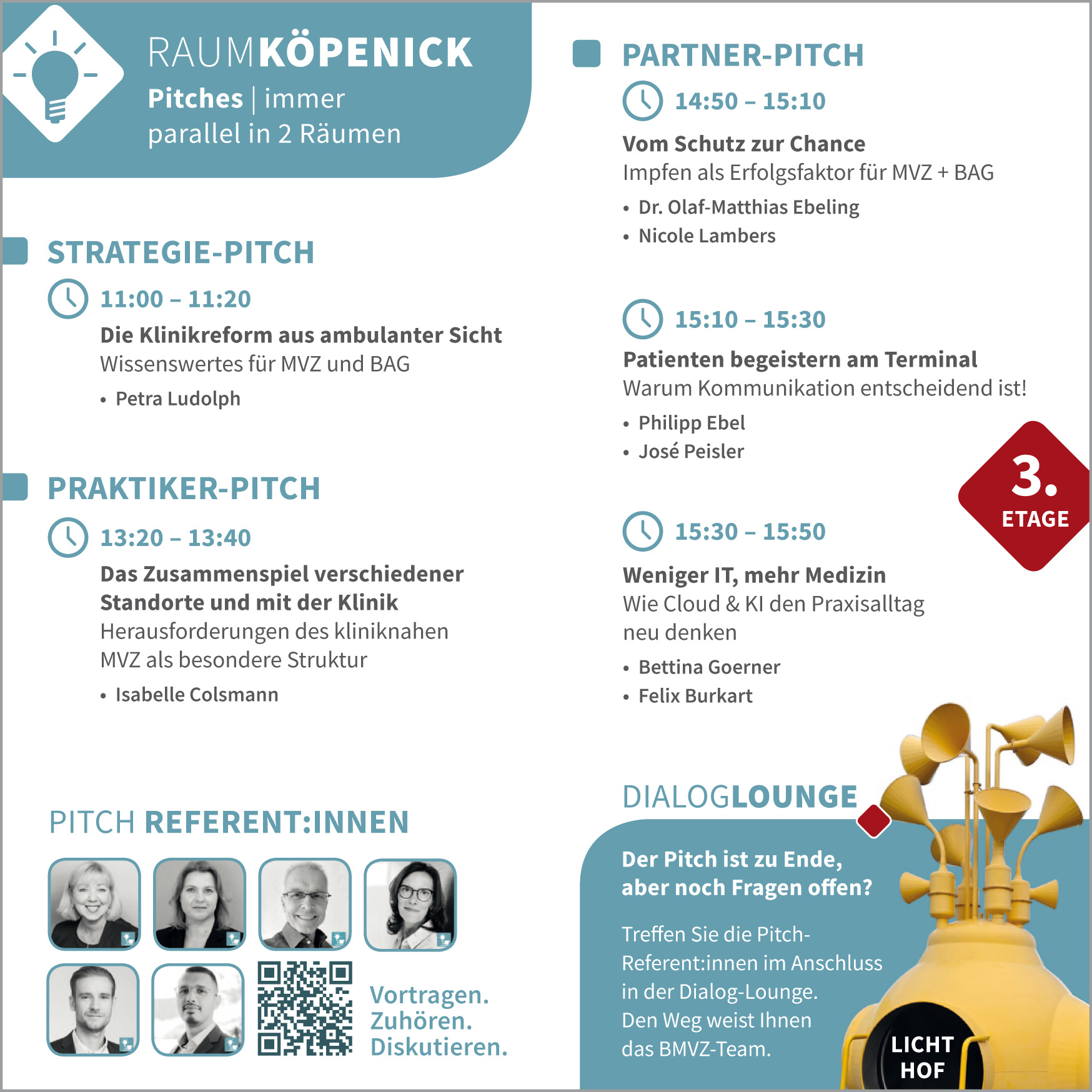 Es ist eine unverbindliche Abfrage – Sie können jederzeit vor Ort neu entscheiden und sich frei bewegen zwischen den Pitches im 3. OG und den Angeboten im Lichthof: Catering, Industrie-Ausstellung, Austausch mit Kolleg:innen und anderen Teilnehmer:innen.